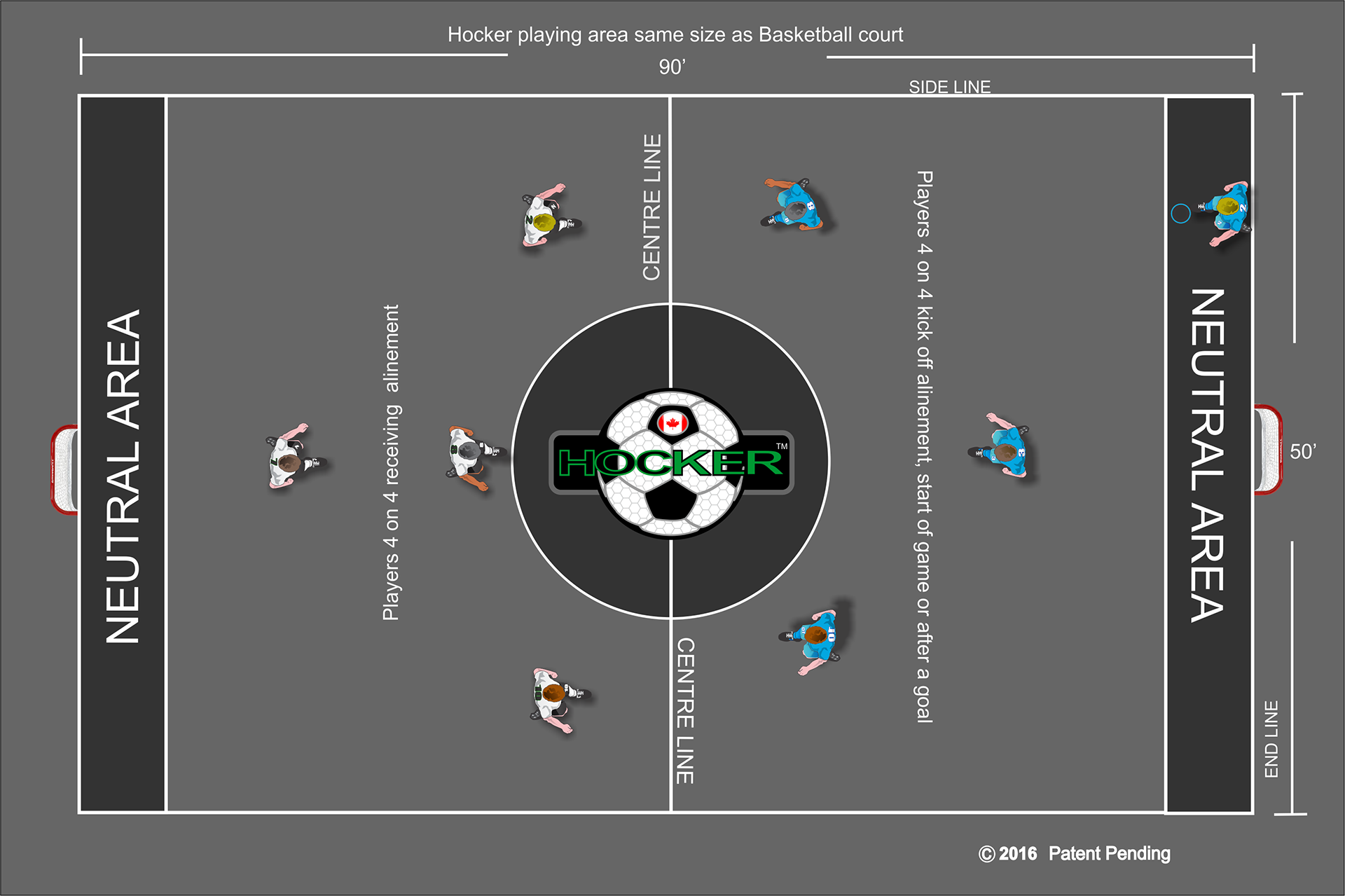 In the sport of Hocker, there are no designated goal keepers. Players can alternate defending the goal while play continues, but no player from any team is allowed to enter the neutral area. When a puck rests in the neutral area, only one player from the defending team can enter the neutral area to pass the puck. If a goal is scored, a referee or a defending player can retrieve the puck.